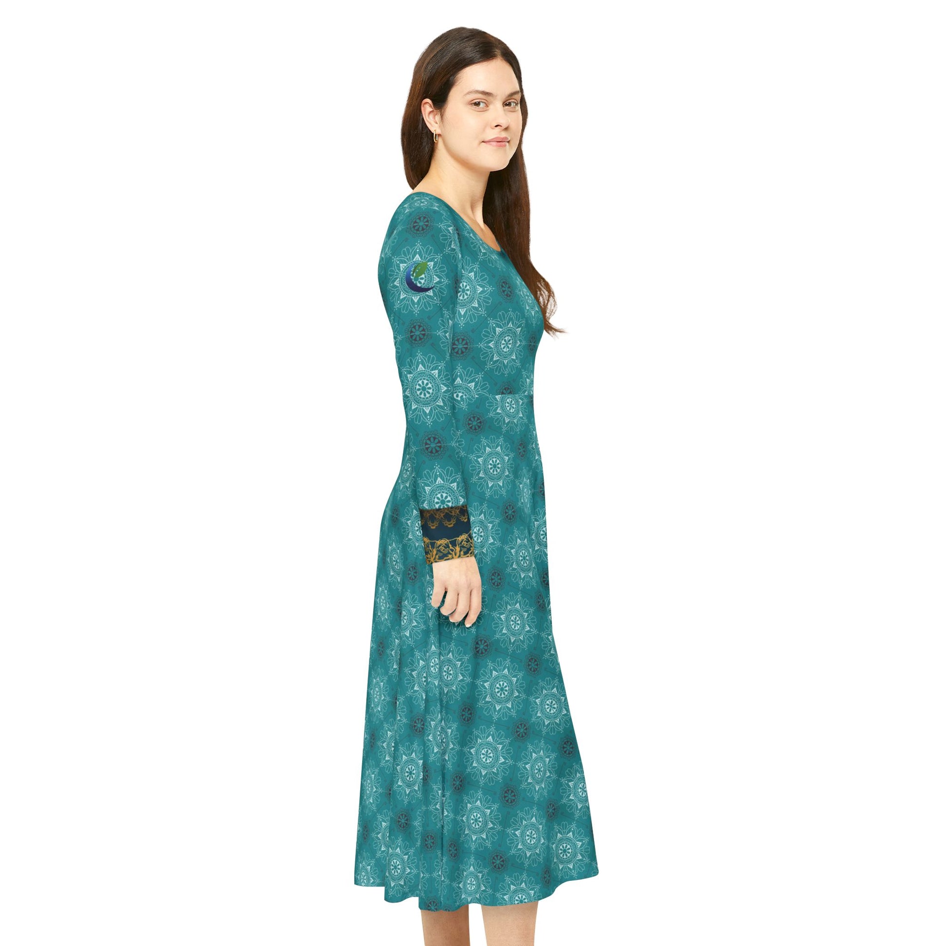 This women's long sleeve dance dress features a geometric Islamic pattern, giving off a unique and elegant vibe. Perfect for dancers and those who appreciate cultural designs. Ideal for special occasions, celebrations, and cultural events.